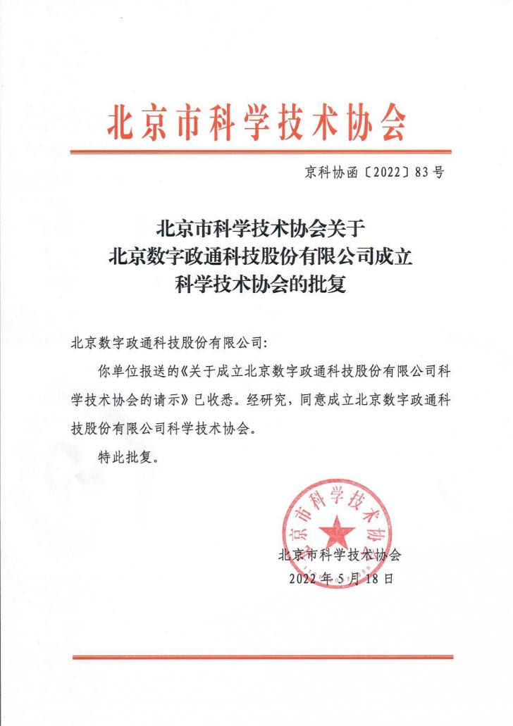 近日,北京市科學技術協(xié)會印發(fā)了《關于北京數(shù)字政通科技股份有限公司成立科學技術協(xié)會的批復》(京科協(xié)函【2022...