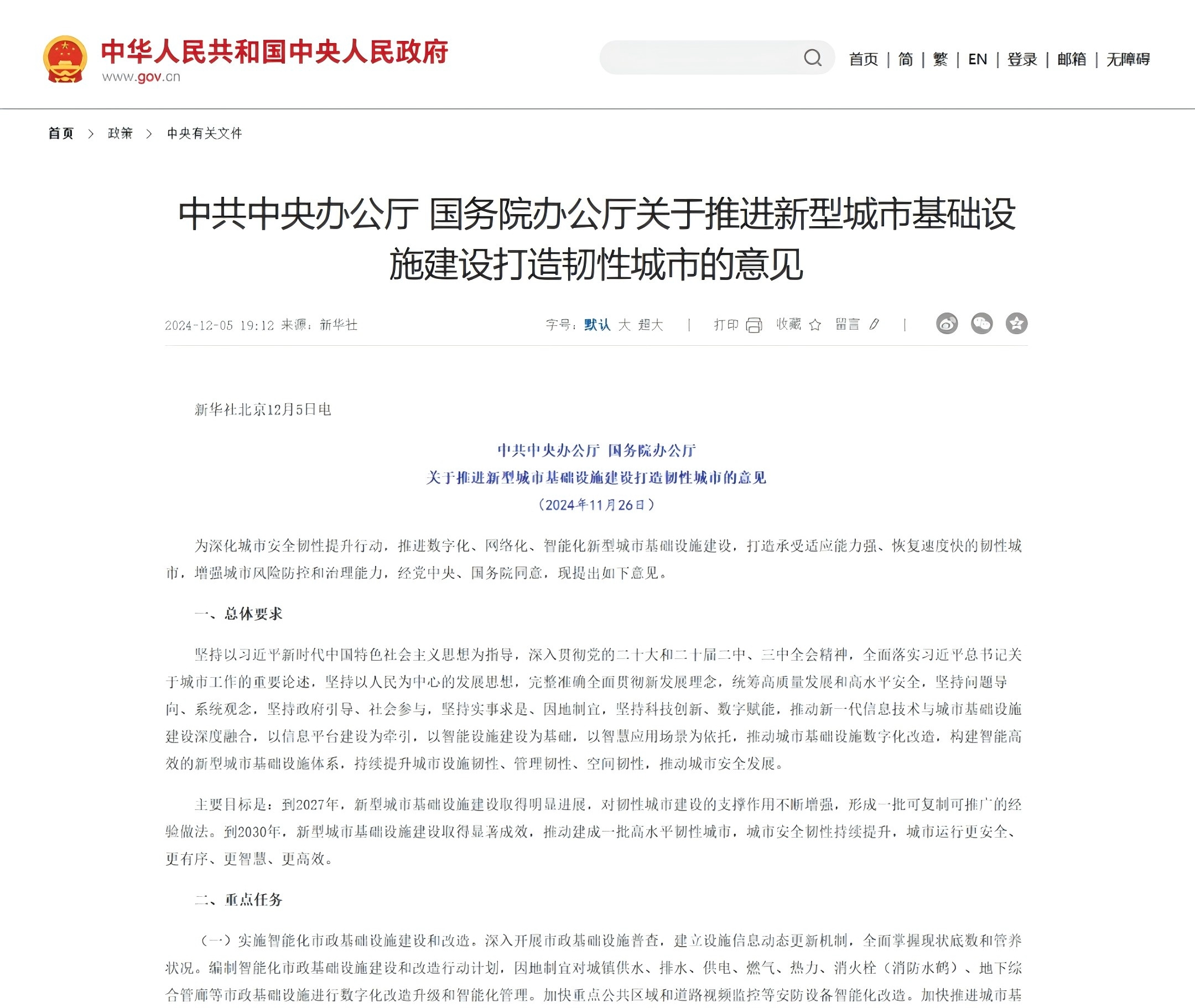 2024年12月5日,中共中央辦公廳、國務院辦公廳發(fā)布了《關于推進新型城市基礎設施建設打造韌性城市的意見》,明...