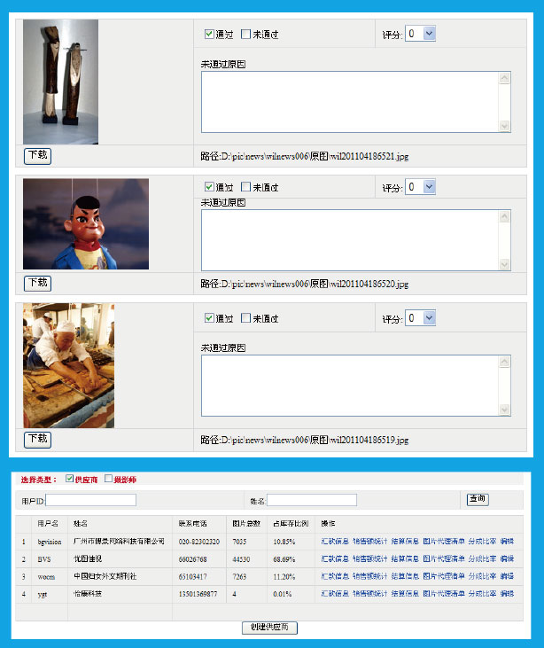 根據(jù)訂購(gòu)日期和圖片名稱可進(jìn)行查詢,顯示用戶訂購(gòu)的RM圖片具體信息,可查看訂購(gòu)會(huì)員的具體資 料,無論是否具有該尺寸的圖片,支持郵件信息反饋賣家身份審核:根據(jù)用戶名,姓名,審核狀態(tài)來查詢相應(yīng)用戶,可查看賣家提交的詳細(xì)信息來審核用戶是否具有賣家的資格。