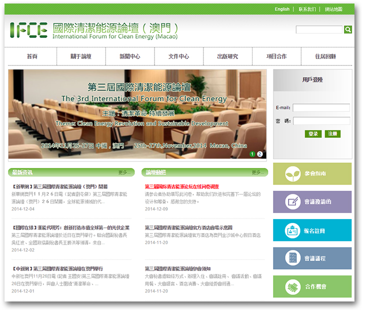 IFCE國(guó)際清潔能源論壇(澳門(mén))會(huì)議網(wǎng)站成功完成全新改版上線,清新的風(fēng)格讓人耳目一新。上線后對(duì)會(huì)議的信息發(fā)布以及會(huì)議的全程管理起到了至關(guān)重要的作用。