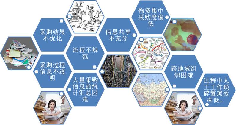 集團(tuán)采購工作瓶頸:采購過程信息不透明、流程不規(guī)范、購結(jié)果不優(yōu)化、信息共享不充分、物資集中采購度偏低、跨地域組織困難、大量采購信息的統(tǒng)計匯總困難、過程中人工工作瑣碎繁瑣效率低。