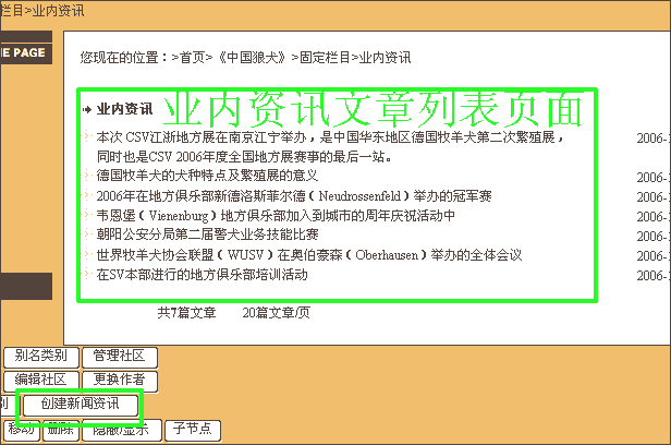 3.從這個(gè)頁(yè)面出發(fā),繼續(xù)尋找,來(lái)到我們要添加文章的界面。例如,我們要在“業(yè)內(nèi)資訊”欄目下添加新文章,那么就要進(jìn)入到“業(yè)內(nèi)資訊”文章列表所在頁(yè)面。在頁(yè)面下方會(huì)見(jiàn)到同上圖一樣的一群按鈕。注意:一定要進(jìn)入真正的列表頁(yè)面,而不是首頁(yè)或其父類頁(yè)面。列表頁(yè)才是我們的“操作車間”。對(duì)于這些按鈕不要眼花,我們常用到的僅僅是其中兩個(gè)而已。點(diǎn)擊“創(chuàng)建新聞資訊”按鈕,進(jìn)入編輯頁(yè)面: