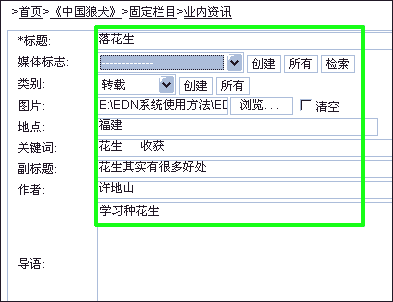 網(wǎng)站吸引瀏覽者的一個(gè)重要途徑就是其內(nèi)容的更新速度,而EDN系統(tǒng)的好處就在于它具有方便快捷的內(nèi)容添加方式。下面的步驟將把這個(gè)過(guò)程一一剖析,讀完這篇文章,相信您一定能夠自如地添加您想展示的任何內(nèi)容。在看這篇文章的過(guò)程中,請(qǐng)注意綠色方框和綠色文字,這些是操作過(guò)程的生動(dòng)體現(xiàn)。例如,向頁(yè)面添加一篇文章《落花生》。