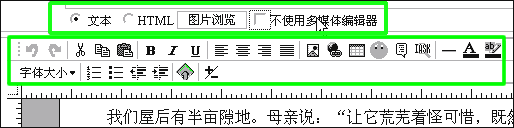 6.先演示使用媒體編輯器的情況。在不勾選“不使用多媒體編輯器”時(shí),就是使用媒體編輯器,這時(shí)的編輯是可視化的,只要按照我們平常在Microsoft office word中寫出來(lái)的結(jié)構(gòu)原樣粘貼,上傳以后的頁(yè)面也會(huì)如此排列。這種方式比較簡(jiǎn)單、明了,所見(jiàn)即所得,適合HTML基礎(chǔ)薄弱的用戶,但缺點(diǎn)是對(duì)圖片文字位置的控制能力較差,產(chǎn)生很多垃圾代碼,占用資源也很大。文字編輯功能同我們?nèi)粘J褂玫腗icrosoft office word幾乎是一樣的,可以進(jìn)行字號(hào)、大小、顏色等修改。編輯器下面的“加號(hào)”和“減號(hào)”可以使編輯窗口擴(kuò)大或縮小,有利于編輯的方便。