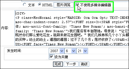 11.在勾選“不使用多媒體編輯器”時(shí),編輯狀態(tài)就是有代碼的樣子,這種狀態(tài)適合有一些HEML代碼基礎(chǔ)的用戶來(lái)使用,它的好處就是定位準(zhǔn)確、垃圾代碼少、占用資源小。使用方法就跟前面一樣,把標(biāo)題、作者添好,把代碼編寫好,點(diǎn)擊完成即可提交。