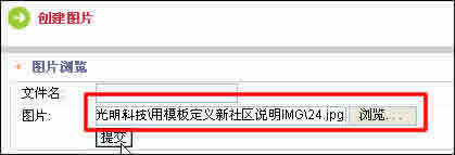 進(jìn)入編輯頁(yè)面。點(diǎn) “圖片瀏覽”,進(jìn)入“創(chuàng)建圖片”頁(yè)面。點(diǎn)“瀏覽”,把需要上傳的圖片瀏覽進(jìn)去。然后 “提交”。