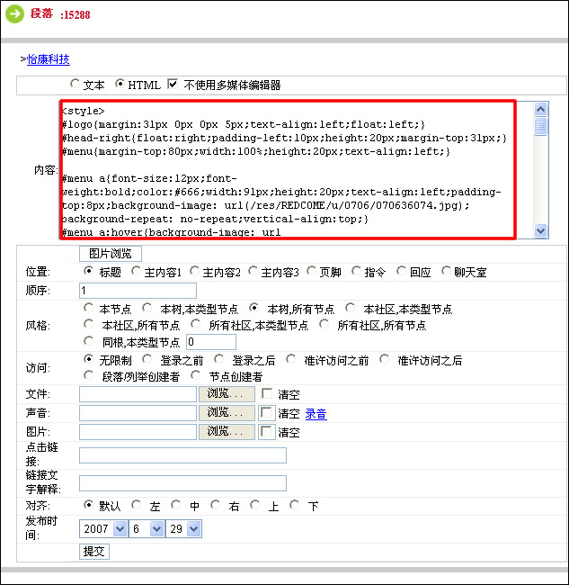 可以進(jìn)入到頁(yè)腳段落的編輯頁(yè)面,與頁(yè)頭一樣,所有頁(yè)腳信息都在這里編輯。將“怡康科技“頁(yè)腳的代碼替換“內(nèi)容”文本域中的代碼,就可以生成新的頁(yè)腳了。