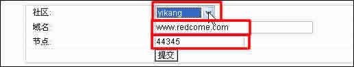 社區(qū)選擇“yikang”,節(jié)點(diǎn)號(hào)就是前面已經(jīng)記下的“yikang”的節(jié)點(diǎn)號(hào)“44345”域名需要提前定好。