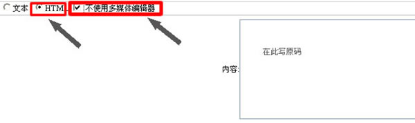 進入創(chuàng)建段落頁面,要選擇HTML和不使用多媒體編輯器,才可在內(nèi)容中寫原代碼如下圖: