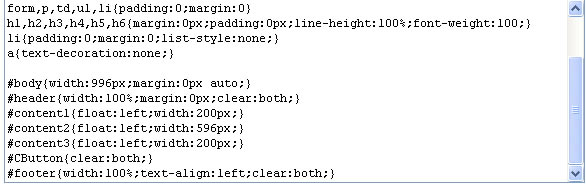 我在總的CSS內(nèi)定義了#body寬996,標(biāo)題、頁腳100%寬,內(nèi)容1、內(nèi)容2、內(nèi)容3分別為200、596和200都浮動居左,如下圖:
