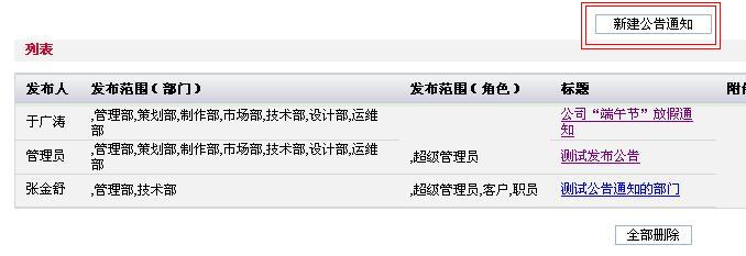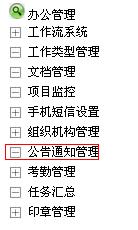 一.新建公告通知:建立完功能菜單后,找到你建立的位置,我們放在了“人力資源管理”下,點(diǎn)擊“”公告通知管理,看到如下圖: