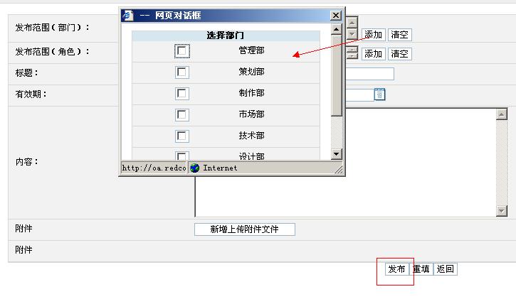 點(diǎn)擊了公告管理,我們就可以現(xiàn)來創(chuàng)建一個(gè)新的公告了,點(diǎn)擊“新建公告通知”按鈕,會(huì)彈出一個(gè)新建公告的頁面,在選擇發(fā)布部門時(shí),點(diǎn)擊后面的“添加”就可以選擇發(fā)布公告通知的部門范圍了,如圖: