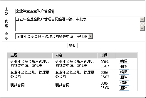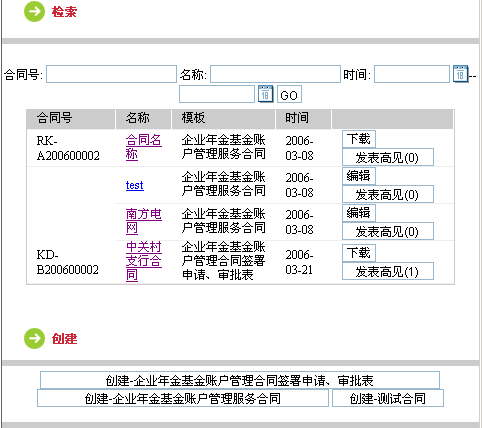 下方是現(xiàn)有全部合同的記錄,記錄著合同編號、合同名稱、模板類型、創(chuàng)建時間、創(chuàng)建會員ID,每條合同后都有發(fā)表高見,發(fā)表高見后的數(shù)字代表該合同有幾條高見;點擊合同名稱,將彈出合同的顯示頁面,可觀看到合同的具體內(nèi)容;可以看到通過審核的合同會出現(xiàn)一個合同號,而沒有通過審核的則沒有。合同號中RK為合同模板類型,A表示為企業(yè)年金理事會,B表示為法人受托機構(gòu),字母后面的數(shù)字表示該合同的編號。通過審核的合同可以供用戶下載,如果未通過審核必須修改編輯,直到通過審核才能被用戶下載。
