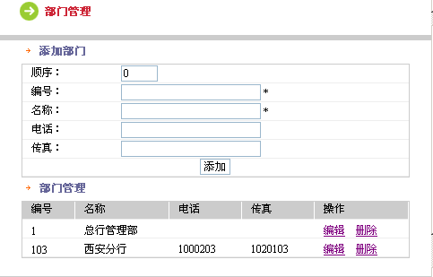 添加、編輯、刪除公司管理部門。添加部門時,輸入順序也就是部門的顯示順序,數(shù)字越小部門就越前顯示。部門編號及名稱是屬于必須填寫的內(nèi)容,電話和傳真可由可無,填好資料后點擊添加,一個新的部門就建好了。