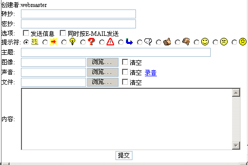 轉(zhuǎn)抄,密抄(加密發(fā)送,防止被其他人所見)用于發(fā)送給其它用戶,填入要發(fā)送的電子郵件地址即可。填入要勾選發(fā)送信息,將會給用戶發(fā)送一條社區(qū)短信息。勾選同時按E-MAIL發(fā)送將會發(fā)送一封電子郵件。填入主題,內(nèi)容,也可以上傳圖像、聲音和附件,填好后點擊提交就可以了。