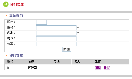 在添加部門表中填寫部門的編號、名稱等相關(guān)信息,點擊添加按鈕。