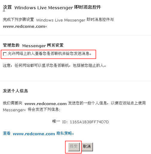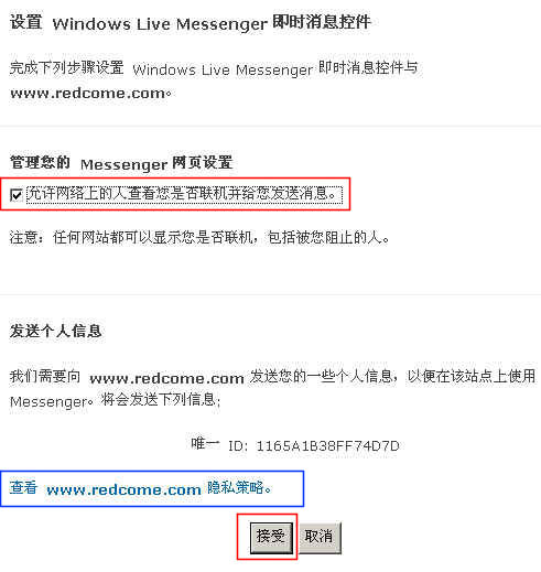 點(diǎn)擊“個(gè)人客服MSN配置”進(jìn)入“設(shè)置 Windows Live Messenge即時(shí)消息控件”頁面;如圖: