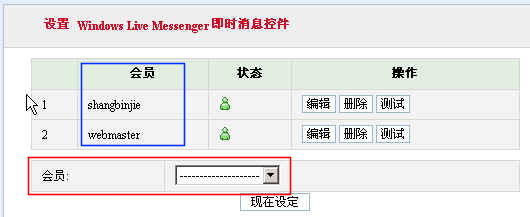 蘭色框里的是已設(shè)定MSN的會(huì)員。紅色框里的下拉框是選擇未設(shè)定MSN的已有會(huì)員。選擇會(huì)員,點(diǎn)擊現(xiàn)在設(shè)定,操作步驟與“設(shè)定個(gè)人MSN”相同。