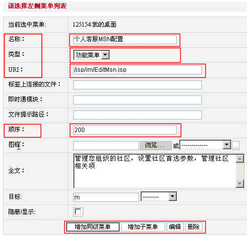 點(diǎn)擊右邊菜單列表中“我的桌面”,在 “菜單管理”界面按照下圖紅色方框所括的內(nèi)容進(jìn)行填充。注意:“類型”下拉列表中包括“文件夾”和“功能菜單”,其中,有子菜單的菜單名選擇文件夾,沒有子菜單的菜單名選擇功能菜單;“URI”是實(shí)現(xiàn)“個(gè)人客服MSN配置”的代碼頁面,填入該代碼頁面的地址;“順序”里面填數(shù)字,數(shù)字越小越排在前面。如下圖:
