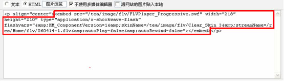 點擊上邊的不使用多媒體編輯器,可以看到插入視頻后生成的代碼,可以復(fù)制紅色區(qū)域的代碼到網(wǎng)頁的任何位置去顯示改段視頻。