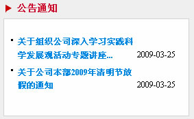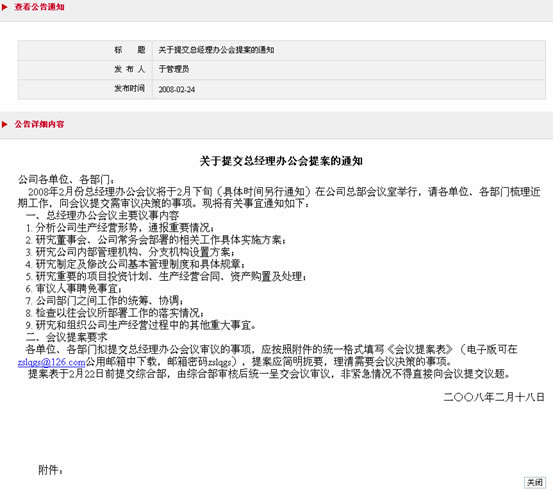 ? 點(diǎn)每一條公告所對(duì)應(yīng)的“標(biāo)題”鏈接,進(jìn)入“查看公告通知”頁(yè)面,在這里可以看到該公告的詳細(xì)內(nèi)容,如圖所示: