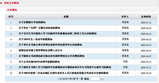 “查看公告通知”頁(yè)面:主要羅列了該用戶有權(quán)查看的公告通知,不同的用戶根據(jù)部門、權(quán)限的關(guān)系,該頁(yè)顯示的公告不同;管理人員在創(chuàng)建這個(gè)公告時(shí),就已經(jīng)指定好可以查看該公告的部門用戶。