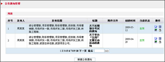 “公告通知管理”頁(yè)面上顯示了公告列表,每一個(gè)公告都是列表中的一條記錄。如圖所示:
