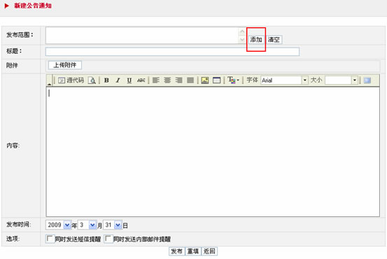 點(diǎn)擊“新建公告通知”,進(jìn)入新建公告通知頁(yè)面。在這里創(chuàng)建新的公告通知。