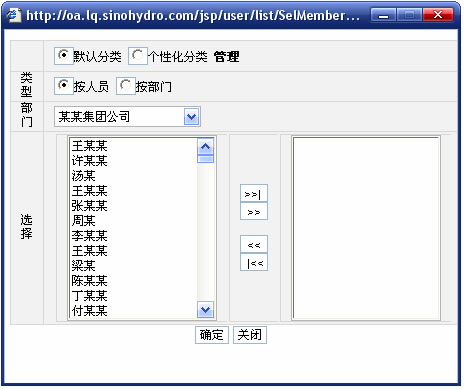 “發(fā)布范圍”中的內(nèi)容從“添加”中選擇。點(diǎn)“添加”,會(huì)彈出對(duì)話框,在對(duì)話框中分別顯示“默認(rèn)分類”和“個(gè)性化分類”,點(diǎn)擊個(gè)性化分類后邊的管理可以自定義分組,在默認(rèn)分類中可以分為按人員和按部門兩個(gè)分類。選擇按人員、按部門,就可以吧對(duì)應(yīng)的人員或者部門添加進(jìn)去。如圖: