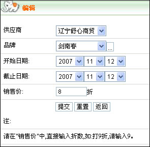 從下拉列表中選擇供應(yīng)商、品牌,選擇開始日期和截止日期,輸入折扣價,點(diǎn)提交,該品牌的商品都會被以相同折扣率打折。