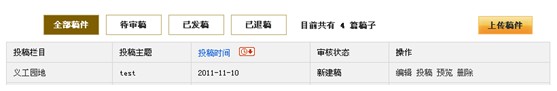 保存并投稿:保存投稿并將投稿發(fā)送給管理員;投稿完成之后,可以在所有投稿中看到所投稿的文件,可以查詢稿件及審核狀態(tài);投稿完成之后將不能修改稿件;所有投稿頁面所示如下圖: