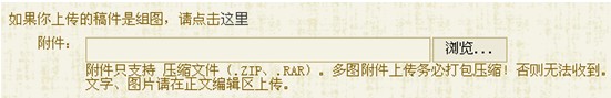 上傳更多圖片及文件:在編輯器的下面點擊“這里”按鈕將出現(xiàn)文件瀏覽上傳,可以將圖片或是文件以附件的形式上傳;附件只支持壓縮文件(.ZIP/.RAR),在上傳之前務(wù)必將圖片及文件打包壓縮,否則將無法收到附件;附件上傳如下圖所示: