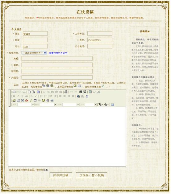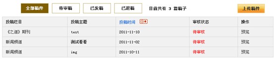 投稿欄目:在頁面中顯示的投稿欄目是由系統(tǒng)自動提取的;在創(chuàng)建新聞資訊的時候選擇“是否投稿使用”系統(tǒng)就會自動將這個欄目提取出來;