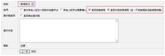 1、創(chuàng)建在線投稿頁面,在創(chuàng)建投稿的時候要選擇新聞資訊類(只有資訊能使用投稿功能);在選擇類別的同時要選擇是否投稿使用和是否內(nèi)容權(quán)限使用;如不選擇“是否投稿使用”在線投稿的欄目將不能提取,則不能對欄目進(jìn)行投稿;如下圖所示: