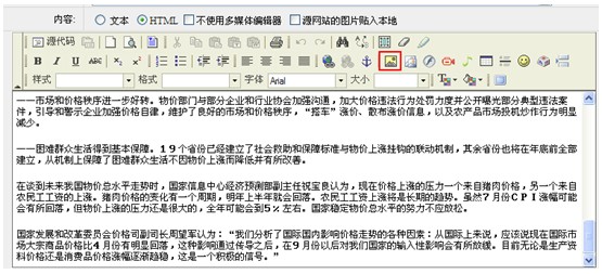 內容圖片的上傳是在上傳欄目內容時在編輯器里上傳的圖片,例如:上傳新聞時新聞內容中含有圖片,該圖片是在新聞上傳頁面中的編輯器里完成的,如圖: 如想在該新聞內容中添加圖片,點擊編輯器中的“圖片”按鈕上傳圖片即可,圖片上傳詳細見7.1節(jié)中“內容的前臺管理”下編輯器