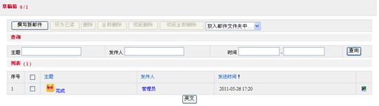 點擊“草稿箱”,進入“消息”頁面。該頁面由“草稿消息列表“和”創(chuàng)建信件”兩部分組成。“草稿消息列表”列出的是寫好但是沒有發(fā)送的郵件,點擊“主題”可以進入詳細內(nèi)容頁面。該頁面如下圖所示: