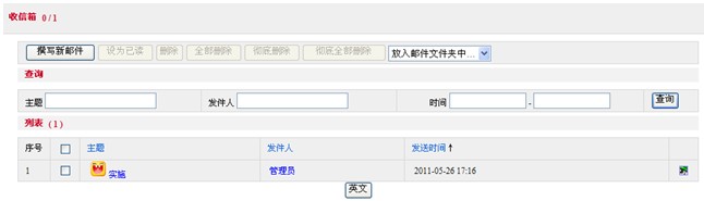 點擊“收件箱”,進入“收件箱消息”頁面。該頁面由“功能按鈕”和 “郵件列表”兩部分組成,下面分別介紹。整個頁面樣式如下圖所示: 用戶從每條郵件記錄前面的選框中勾選對應(yīng)的郵件,然后點擊上面的按鈕處理該郵件。并可批量完成相關(guān)操作,比如:批量刪除、移動。下面是各個