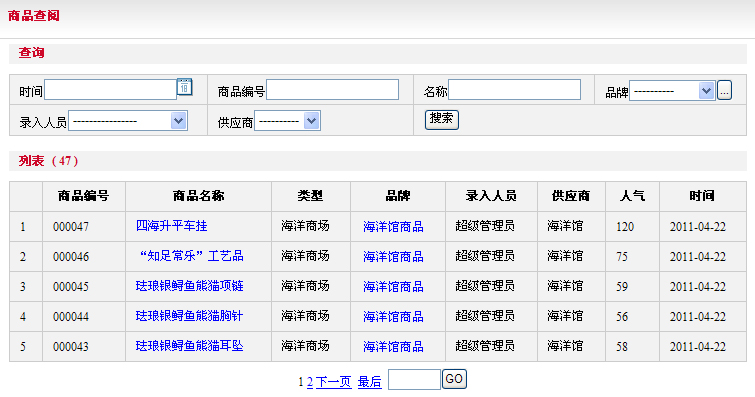 打開商品管理菜單>商品查閱 進(jìn)入商品查閱頁面用戶可以看到一個(gè)商品列表,其列表不可以對(duì)商品進(jìn)行創(chuàng)建、修改及刪除,只可以查詢及瀏覽;可以查看商品編號(hào)、商品名稱、商品類型、商品品牌、錄入人員、供應(yīng)商及商品的瀏覽次數(shù)和商品上傳時(shí)間;商品查閱頁面如下圖:
