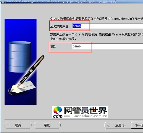 ![]() 圖5 全局?jǐn)?shù)據(jù)庫名,格式一般為:db_name.db_domain。db_name用于對應(yīng)數(shù)據(jù)庫名,db_domain對應(yīng)于網(wǎng)絡(luò)域名。SID(例程)應(yīng)該與db_name完全一致.如圖5都設(shè)置為:demo.