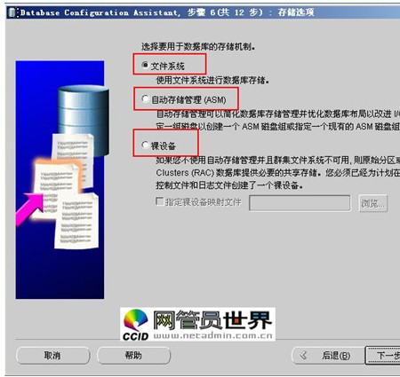 設(shè)置口令后,單擊“下一步”,會出現(xiàn)“存儲選項(xiàng)”對話框,該對話框用于指定數(shù)據(jù)庫的存儲機(jī)制(文件系統(tǒng)、自動存儲管理、裸設(shè)備),如圖8: