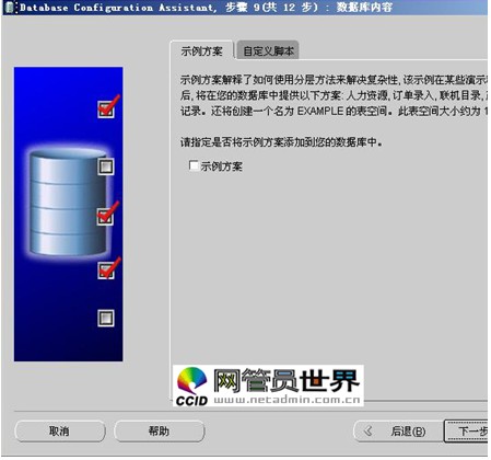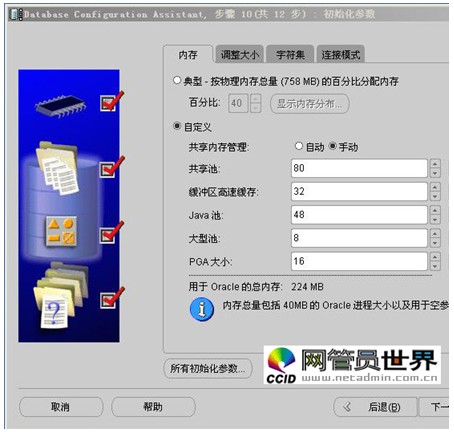 單擊“下一步”,會出現(xiàn)“數(shù)據(jù)庫內(nèi)容”對話框,該對話框用指定是否安裝示例方案,并運(yùn)行自定義腳本。如圖11: ![]() 圖11 單擊“下一步”,會出現(xiàn)“初始化參數(shù)”對話框,該對話框用配置初始化參數(shù)、數(shù)據(jù)庫字符集和連接模式。如圖12: