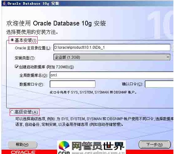 ![]() 圖2 在安裝Oracle DataBase 10g時可以選擇“基本安裝”和“高級安裝”兩種方法。選擇“基本安裝”時,“Oracle主目錄位置”用于指定Oracle DataBase 10g軟件的存放位置;“安裝類型”用于指定Oracle產(chǎn)品的安裝類型(企業(yè)版、標(biāo)準(zhǔn)版和個人版)。如果選擇“創(chuàng)建啟動數(shù)據(jù)庫”,那就要指定全局?jǐn)?shù)據(jù)庫名稱和數(shù)據(jù)庫用戶的口令。