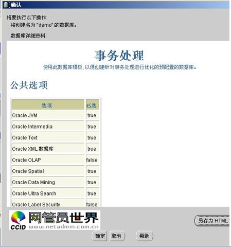 單擊“完成”,會顯示“確認(rèn)”對話框,列出了要安裝Oracle選項(xiàng)的所有信息。如圖15: