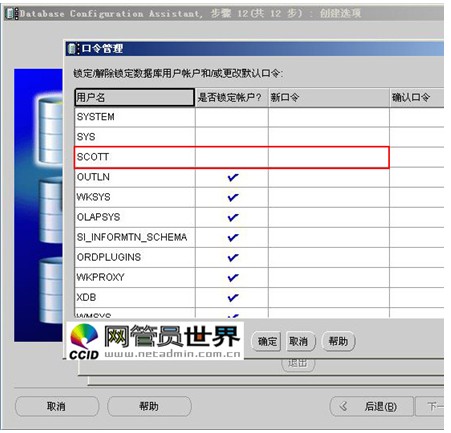 當(dāng)建立完成數(shù)據(jù)庫后,系統(tǒng)會鎖定除SYS、SYSTEM、DBSNMP、SYSMAN之外的所有其他用戶。應(yīng)為以后要使用SCOTT用戶,所以在點(diǎn)擊“口令管理”按鈕后,解鎖SCOTT用戶,如圖18:
