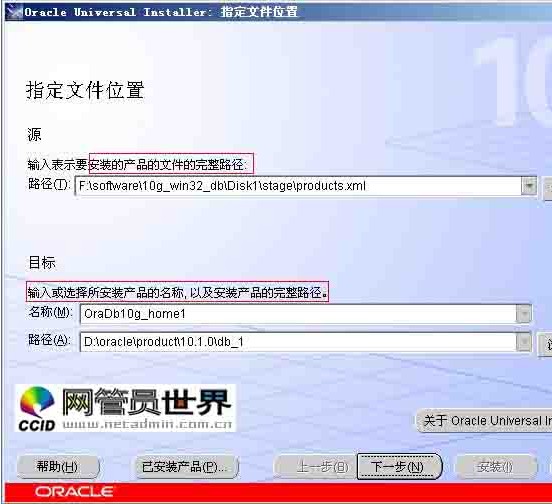 選擇“高級安裝”,單擊“下一步”,會出現(xiàn)“指定文件對話框”,在源路徑顯示的是安裝產(chǎn)品所在的磁盤路徑;目標(biāo)名稱用于資定Oracle主目錄所對應(yīng)的環(huán)境變量,目標(biāo)路徑用于指定安裝Oracle軟件的目標(biāo)安裝路徑。設(shè)置目標(biāo)名稱為:OraDb10g_home1,目標(biāo)路徑為:D:oracleproduct10.1.0db1。如圖3: