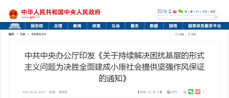 近日,中共中央辦公廳印發(fā)了《關(guān)于持續(xù)解決困擾基層的形式主義問題為決勝全面建成小康社會(huì)提供堅(jiān)強(qiáng)作風(fēng)保證的...