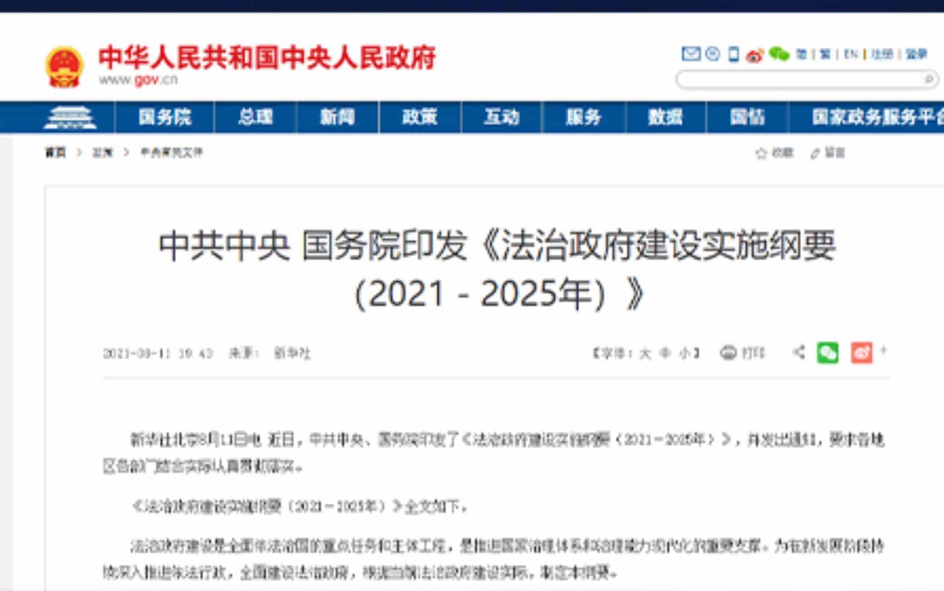 近日,中共中央、國(guó)務(wù)院印發(fā)了《法治政府建設(shè)實(shí)施綱要(2021-2025年)》,并發(fā)出通知,要求各地區(qū)各部門結(jié)合實(shí)際認(rèn)真貫...