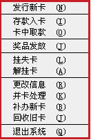 此菜單的功能主要是:用于當(dāng)用戶的卡由于各種原因丟失時(shí),可以到店里進(jìn)行掛失處理,防止別人撿到時(shí)冒充消費(fèi),掛失后可以再補(bǔ)辦一張新卡(詳見[補(bǔ)辦新卡]),當(dāng)然,當(dāng)用戶找到原卡時(shí)還可到店里對(duì)卡進(jìn)行解掛,(詳見[解掛卡])。