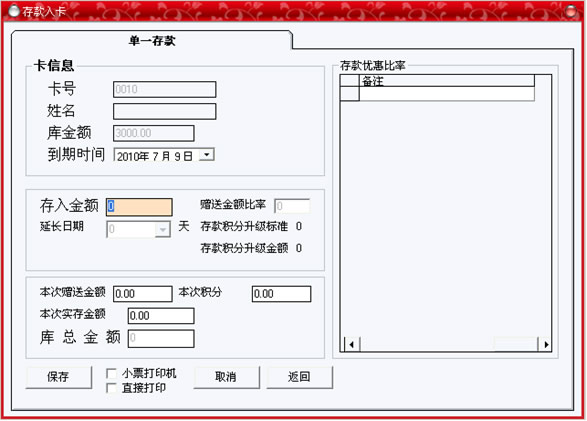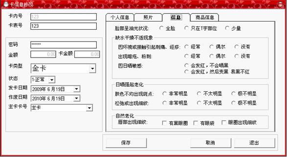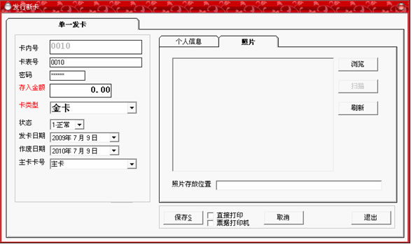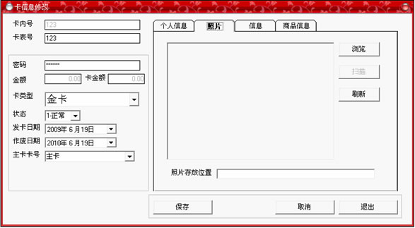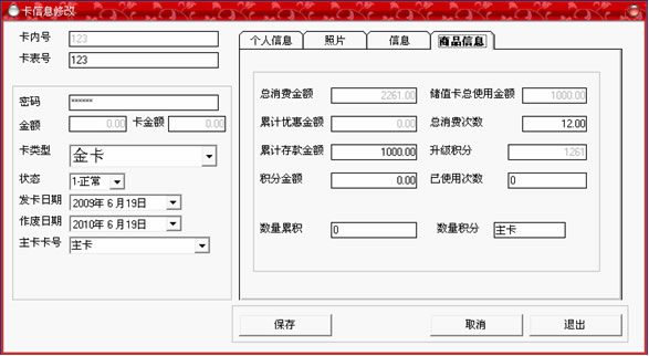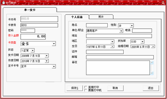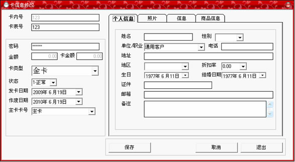 黑色,即可以輸入卡中所存入的金額,如果類型為會(huì)員卡,那么將顯示為灰色;在右邊的個(gè)人信息選擇中,可以詳細(xì)記錄持卡人的各種資料,全部填寫完畢后,點(diǎn)“保存”按鈕。