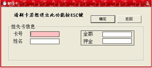 此菜單上面已經(jīng)提到,主要功能是對(duì)已經(jīng)掛失的卡進(jìn)行解掛,恢復(fù)正常使用。